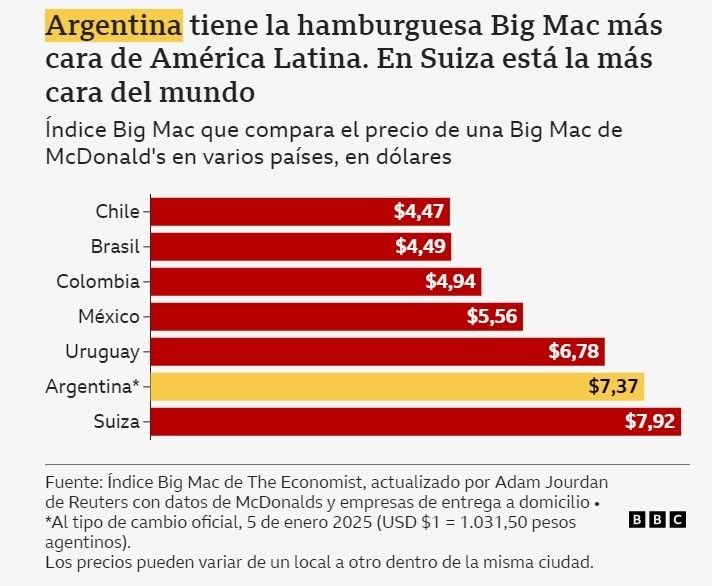 De acuerdo con el índice de precios Big Mac de McDonald's, creado por The Economist en 1986, Argentina con US$7.37 tiene el precio más caro de la hamburguesa de América Latina y el segundo del mundo, detrás de Suiza.