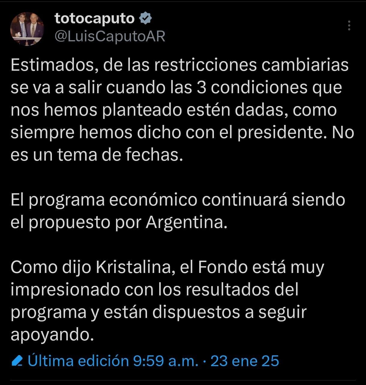 En medio de los rumores sobre el posible salto que podría dar el precio del dólar, las negociaciones con el Fondo Monetario Internacional(FMI) y las presiones que recibe el Gobierno de Javier Milei para dar detalles sobre la salida del cepo cambiario, Luis Caputo ratificó la postura oficial en su cuenta oficial de X.