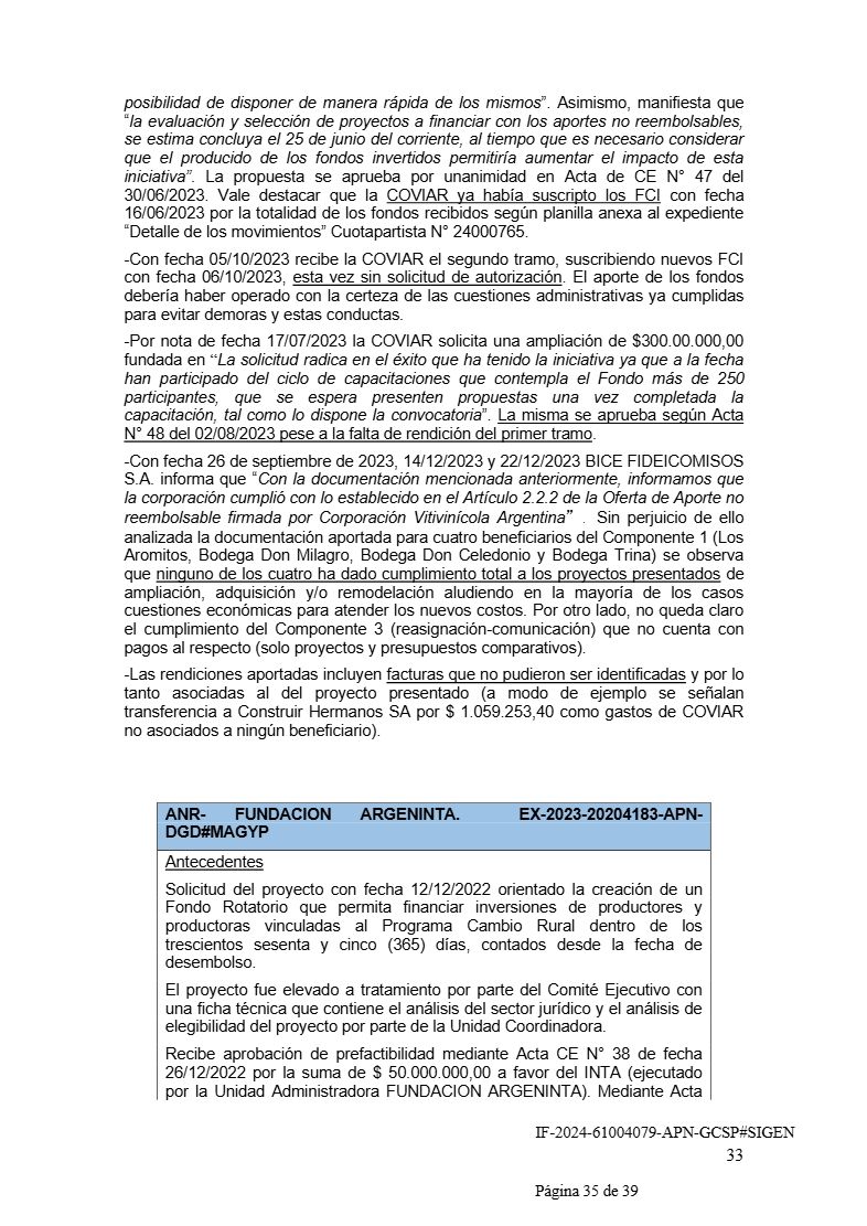 “Las rendiciones aportadas incluyen facturas que no pudieron ser identificadas y por lo tanto asociadas al del proyecto presentado (a modo de ejemplo se señalan transferencia a Construir Hermanos SA (con sede en Chilecito, La Rioja) por 1.059.253 pesos como gastos de Coviar no asociados a ningún beneficiario”, sumaron.