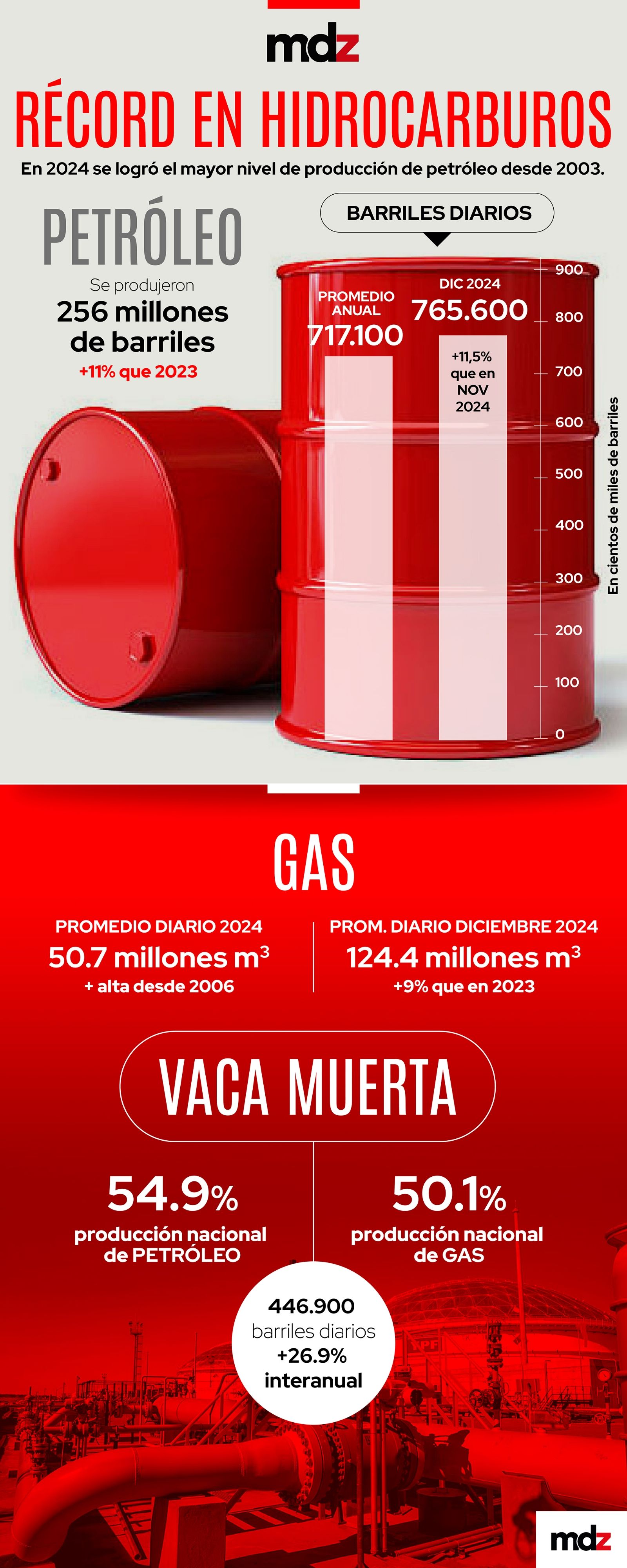 El país vivió un año histórico en la producción de hidrocarburos. Es que en 2024, se logró el mayor nivel de producción de petróleo desde 2003. La industria generó más de 256 millones de barriles, lo que representa un crecimiento del 11% respecto al año anterior, según informó la Secretaría de Energía.