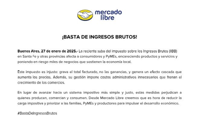 "En lugar de avanzar hacia un sistema impositivo más simple y justo, estas medidas perjudican a quienes producen, comercian y consumen. Desde Mercado Libre creemos que es hora de reducir la carga impositiva y priorizar a las familias, PyMEs y productores para impulsar el desarrollo económico. #BastaDeIngresosBrutos", concluyen desde la empresa.