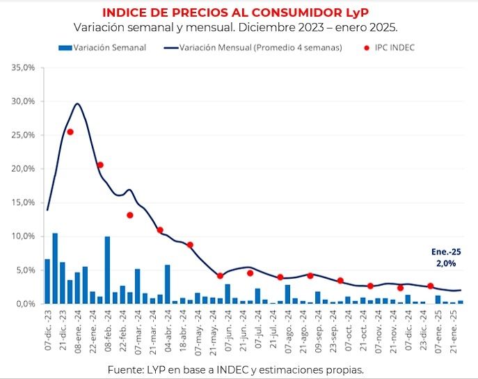 El IPC de LyP (Libertad y Progreso), por su parte, registró un aumento del 2% en enero, unos 0,7 puntos porcentuales por debajo del dato oficial de diciembre (2,7%). La variación anual registrada fue de 84,3%, perforando la barrera del 100% por primera vez desde enero de 2023. Esta desaceleración, de 33 puntos porcentuales respecto al dato anterior, representa la novena consecutiva.