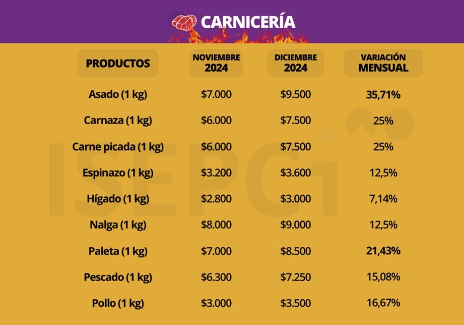 Según la información proporcionada por el Instituto de Investigación Social, Económica y Política Ciudadana (ISEPCI), al corte preferido de los argentinos le siguieron la carnaza y la carne picada que se encarecieron en un 25%. Por su parte, la paleta tuvo un alza del 21,4%, mientras que el pollo costó un 16,6% más durante el último mes de 2024.