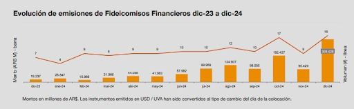 El volumen mensual de emisiones de fideicomisos financieros fue el más alto del año con 18 licitaciones, de las cuales 17 fueron denominadas en pesos y 1 en UVA, registrando un importe total de $309.426 millones (aumento nominal del 224% versus el mes anterior).