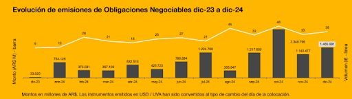 En lo que respecta a diciembre, el mercado captó un total de $474.396 millones, US$ 1.225 millones y 45 millones en UVA (equivalente a un total de 1.750 millones de dólares CCL), vía 56 emisiones (18 de FF y 38 de ON), ubicándose entre los meses de mayor actividad del año en términos de montos nominales y volumen de colocaciones.