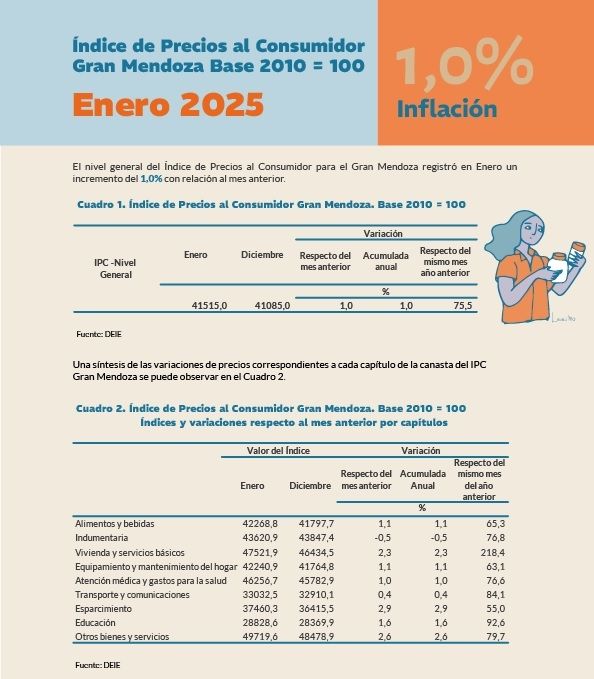 En la tarde de este jueves, la noticia sobre la inflación despertó especial sorpresa en la provincia de Mendoza. Si bien se esperaba un número más bajo al de diciembre, el dato del 1% en el avance del Índice de Precios al Consumidor (IPC) difundido por la Dirección de Estadísticas e Investigaciones Económicas (DEIE) llamó la atención, sobre todo por la diferencia con el valor nacional que se ubicó en torno al 2,2%.