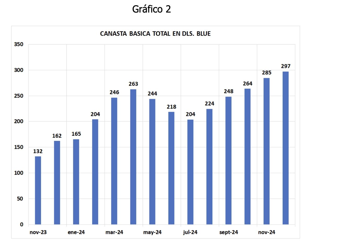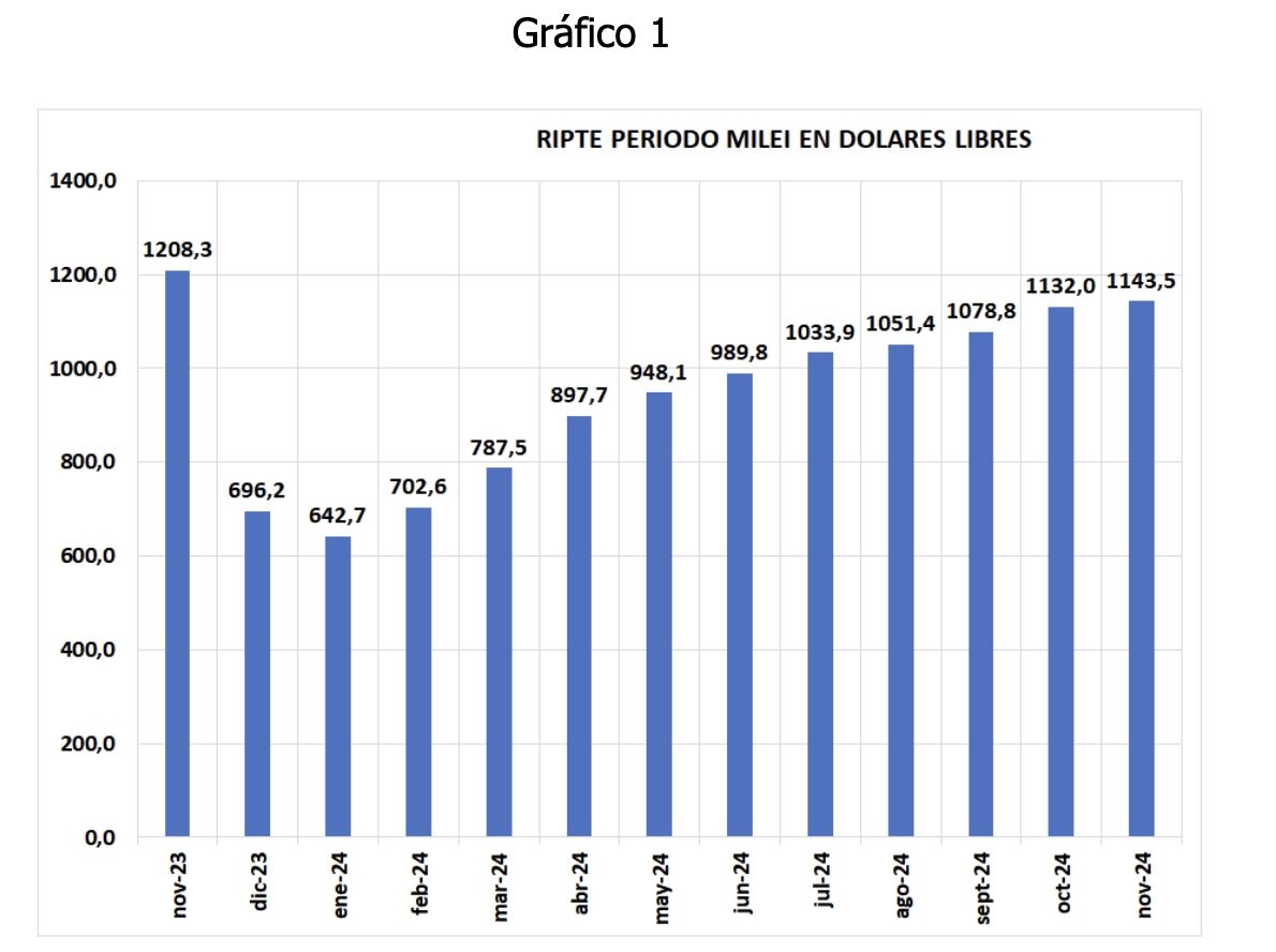 Si bien los datos de la CBT llegan hasta diciembre, los datos del RIPTE llegan hasta noviembre, por lo tanto, si se compara la CBT de noviembre de 2024 con la de diciembre 2023 para seguir el mismo criterio de comparación con el RIPTE, vemos que la CBT aumentó el 76% en dólares.