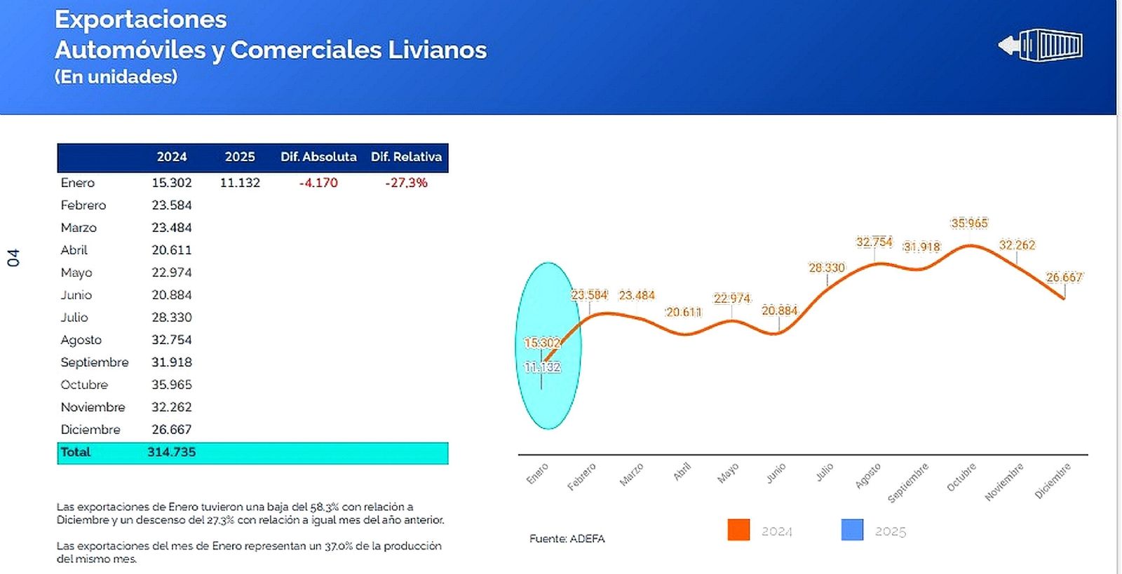 Se fabricaron en el primer mes del año 30.058 unidades, es decir, un 20,9% menos que el volumen de diciembre. Aunque la producción fue un 32,7% más que enero de 2024, hay que señalar que la base de comparación es muy pobre ya que el enero de 2024 fue por lejos el peor mes del año.