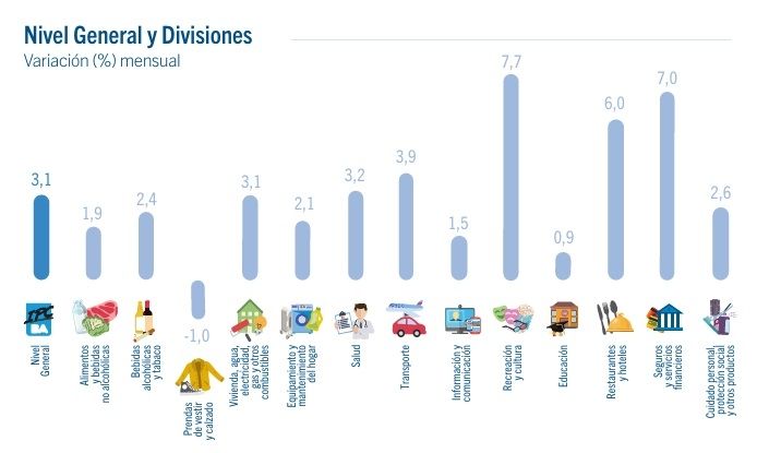 Las mayores subas se dieron en Recreación y cultura (7,7%), Seguros y servicios financieros (7%), Restaurantes y hoteles (6,0%), Transporte (3,9%), Salud (3,2%), Vivienda, agua, electricidad, gas y otros combustibles (3,1%), y Alimentos y bebidas no alcohólicas (1,9%).