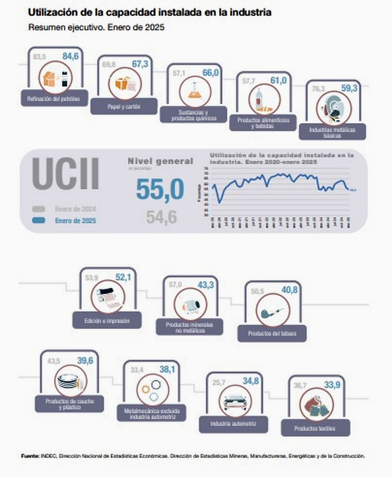 La utilización de la capacidad instalada en la industria manufacturera llegó en el mes de enero, normalmente el más flojo del año, al 55%, un nivel ligeramente superior al del mismo mes del año anterior, cuando fue del 54,6%, y continúa en números históricamente bajos para el mes, según los datos del Indec.