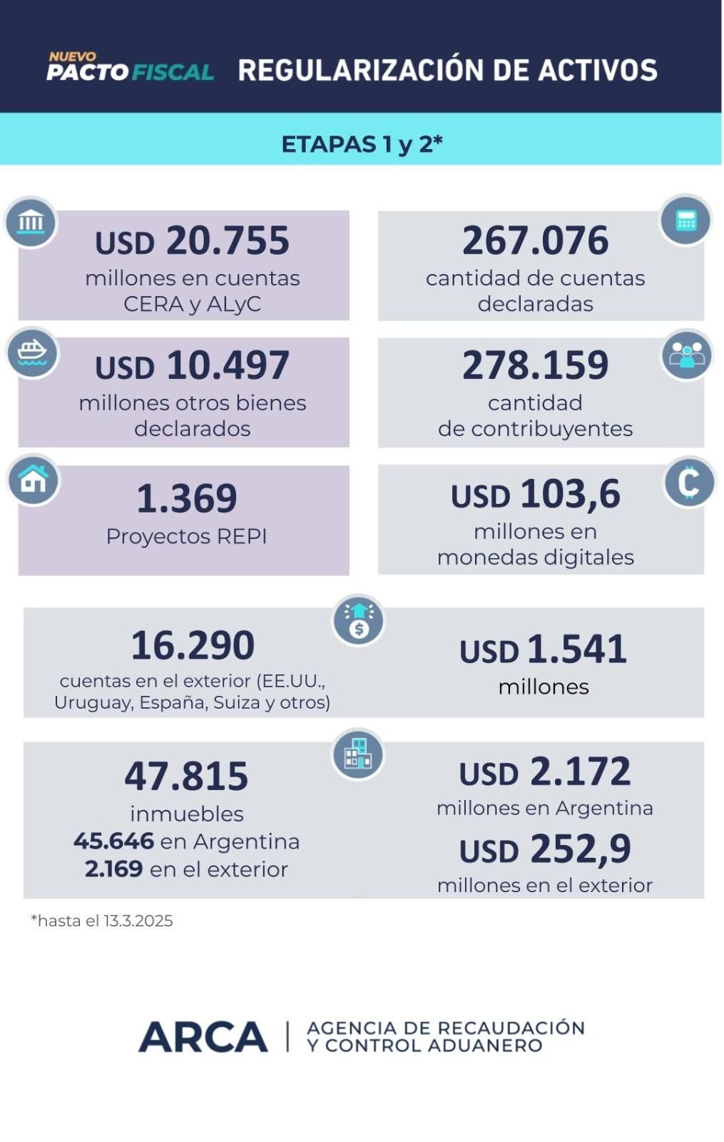 Mientras el Gobierno de Javier Milei soporta la presión por la falta de acuerdo con el Fondo Monetario Internacional (FMI), llega una noticia que le da algo de tranquilidad. Según dieron a conocer desde la Agencia de Recaudación y Control Aduanero (ARCA), al cierre de la segunda etapa del programa de regularización de activos se alcanzaron los 31.252 millones de dólares declarados.