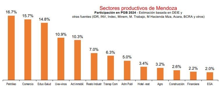 Conforme a lo expuesto por el Ieral, a números del 2024, la producción de uva-vinos es la cuarta actividad en importancia y representa el 10,9% del PGB mendocino, mientras que la hotelería-restauración acapara el 3,4%. El podio se lo llevan el petróleo, con el 16,7%, la actividad comercial, con el 15,7% y completa el sector de educación-salud con 14,8%.