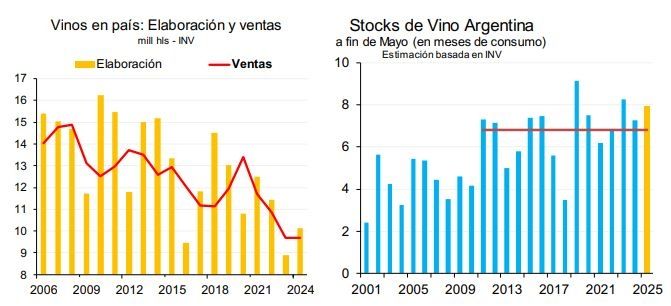 Para el Ieral es un punto llamativo la caída en ventas de vinos espumosos (-20%). También pusieron foco en la mayor elaboración y similares ventas de vinos, lo que se tradujo en mayores stocks de vinos y, sumado a la mayor cosecha esperada para este 2025 puede llegar a ser un problema para las bodegas si no se reactiva el consumo.