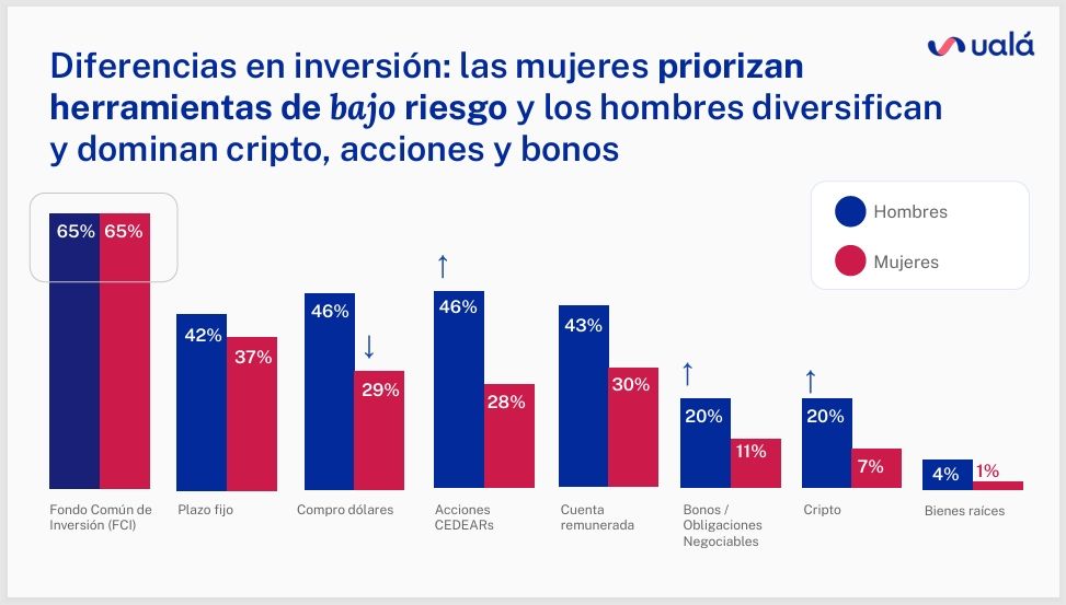 El informe de Ualá hace una enumeración de las opciones de inversión más populares. Los fondos comunes de inversión son los más elegidos tanto por hombres como por mujeres, con un 65%. Las inversoras también utilizan los plazos fijos -37%- y las cuentas remuneradas -30%-.