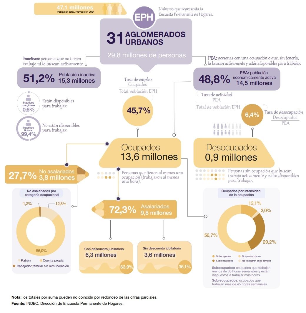 La tasa de actividad se ubicó en 48,8% y el indicador de empleo en 45,8%, con suba de 0,5 puntos y 0,7 puntos por encima del trimestre anterior. Respecto del mismo trimestre del año 2023, los indicadores se ubicaron en 48,6% y 45,7%, con bajas de 0,2 y 0,1 puntos respectivamente.