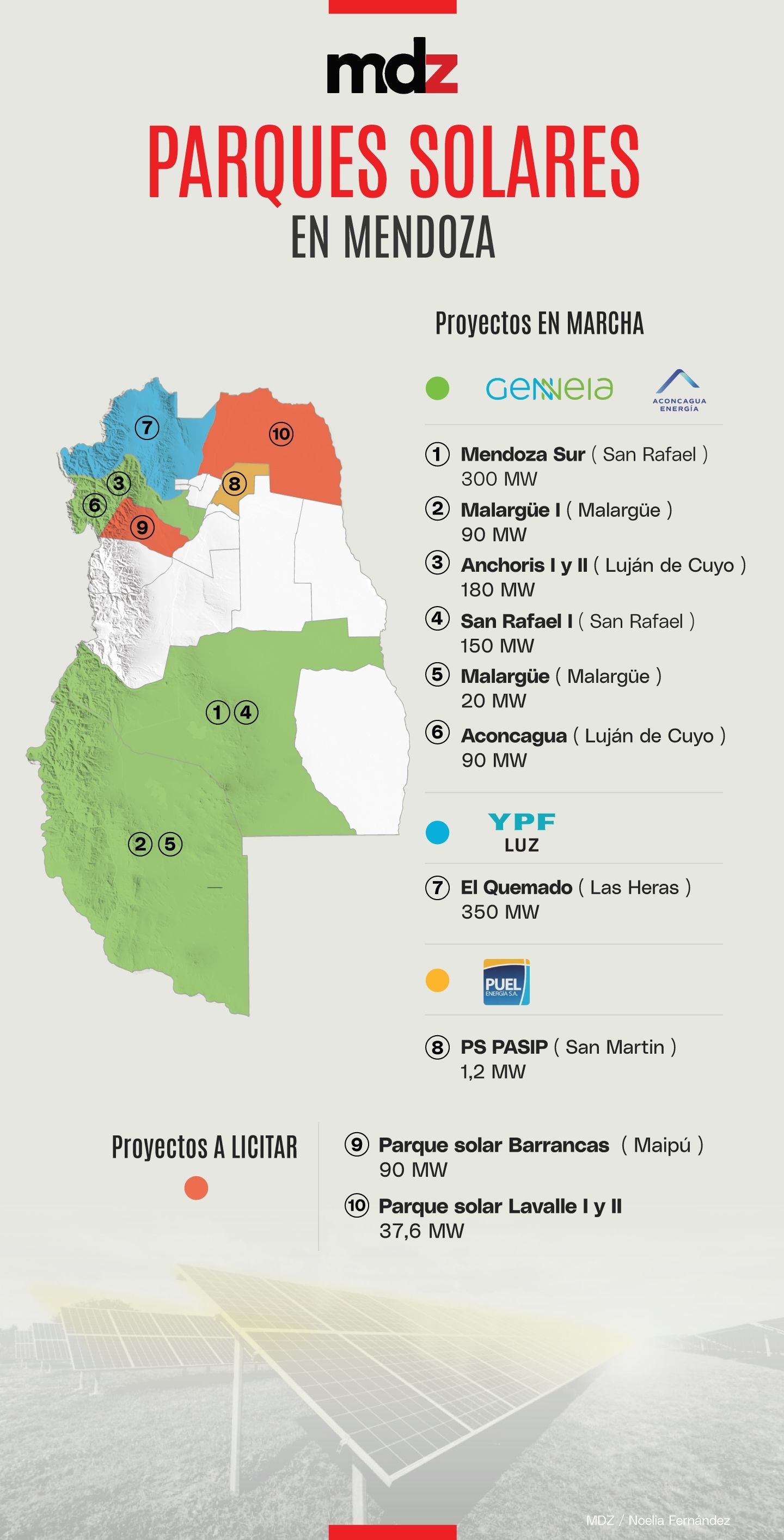 El desarrollo de la energía solar en la provincia se ha dado a partir del trabajo conjunto del Gobierno de Mendoza, a través de la Empresa Mendocina de Energía Sociedad Anónima (Emesa), y el sector privado, con compañías como Genneia, Aconcagua Energía, YPF Luz o Puel que han hecho sus inversiones desde el norte al sur provincial.