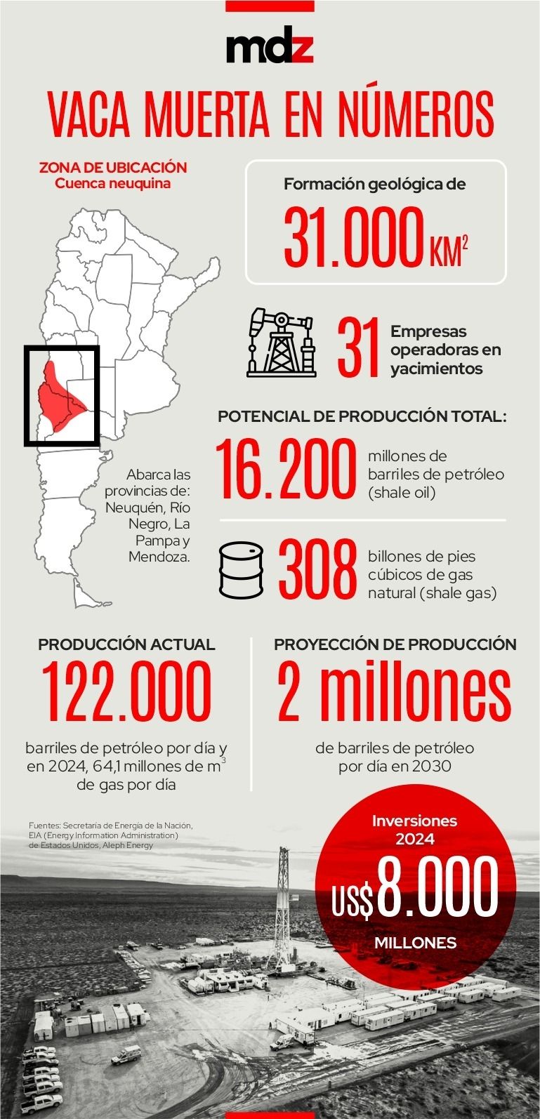 Son 31 las empresas operadoras de yacimientos en toda la zona, aunque si se suman las proveedoras de insumos y servicios, más las empresas que realizan las obras de infraestructura, son varios centenares. Según un informe de Aleph Energy, en base a datos de la secretaría de Energía, se invirtieron sólo en el año 2024 US$ 11.400 millones en la industria petrolera, de los que el 80% fue a parar a Vaca Muerta, US$ 467 millones fueron para exploración y US$ 306 millones a proyectos offshore.
