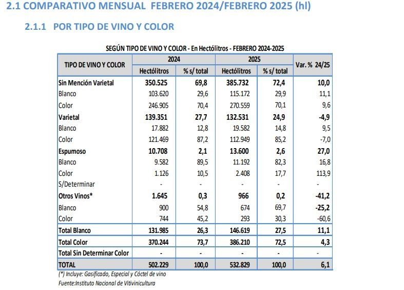 Conforme a los números expresados en el anticipo de comercialización del Instituto Nacional de Vitivinicultura (INV), en febrero de 2025 se dio un aumento de 6,1% respecto al mismo mes del año anterior. El mismo es el promedio de una suba de 4,3% en los despachos de vino a color y de 11,1% en los blancos.