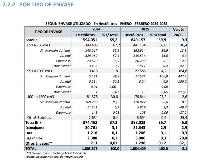 Sobre los envases, en ese mismo periodo, en comparación con 2024, la botella ha crecido un 9,3%; el tetra brik aumentó su despachos en un 6,3%; la damajuana también tiene un saldo positivo de 2,9%, mientras que el bag in box ha marcado un incremento de 29%.La lata es la única con números en rojo con un -0,3%.