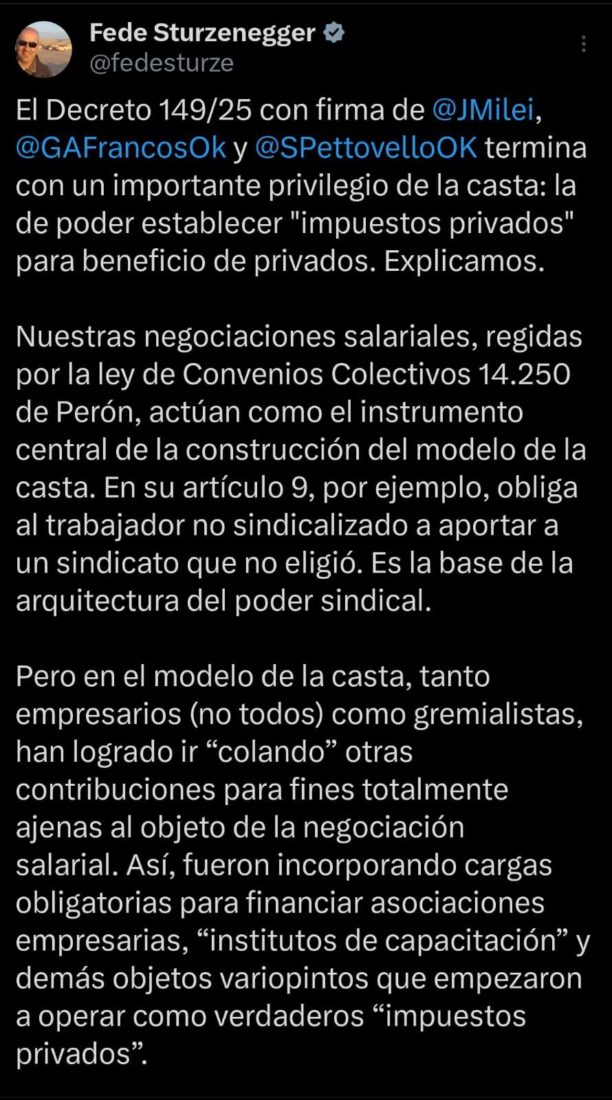 Como es habitual, el Ministro de desregulación, Federico Sturzenegger, celebró la decisión oficial por medio de una publicación en su cuenta de X y explicó los motivos que impulsaron su implementación. "En el modelo de la casta, tanto empresarios (no todos) como gremialistas, han logrado ir 'colando' otras contribuciones para fines totalmente ajenas al objeto de la negociación salarial", sostiene en el texto.