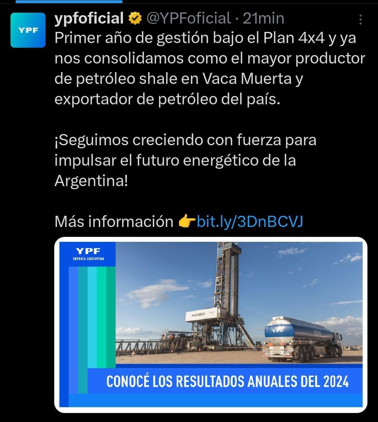 “Primer año de gestión bajo el Plan 4x4 y ya nos consolidamos como el mayor productor de petróleo shale en Vaca Muerta y exportador de petróleo del país. ¡Seguimos creciendo con fuerza para impulsar el futuro energético de la Argentina!”, celebró la compañía en una publicación de la red social X.