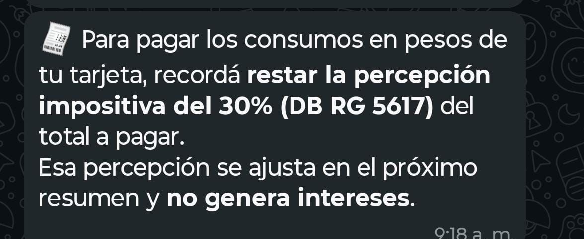 Sin embargo, existe una vuelta de rosca para evitar el pago de estos tributos que las propias entidades se encargaron de explicar; o al menos algunas de ellas. “Si querés pagar tus consumos en dólares de tu tarjeta de crédito, hacelo desde tu cuenta en dólares o en efectivo a partir del día posterior al cierre hasta el vencimiento”, aclaró una financiera por medio de Whatsapp a sus usuarios.