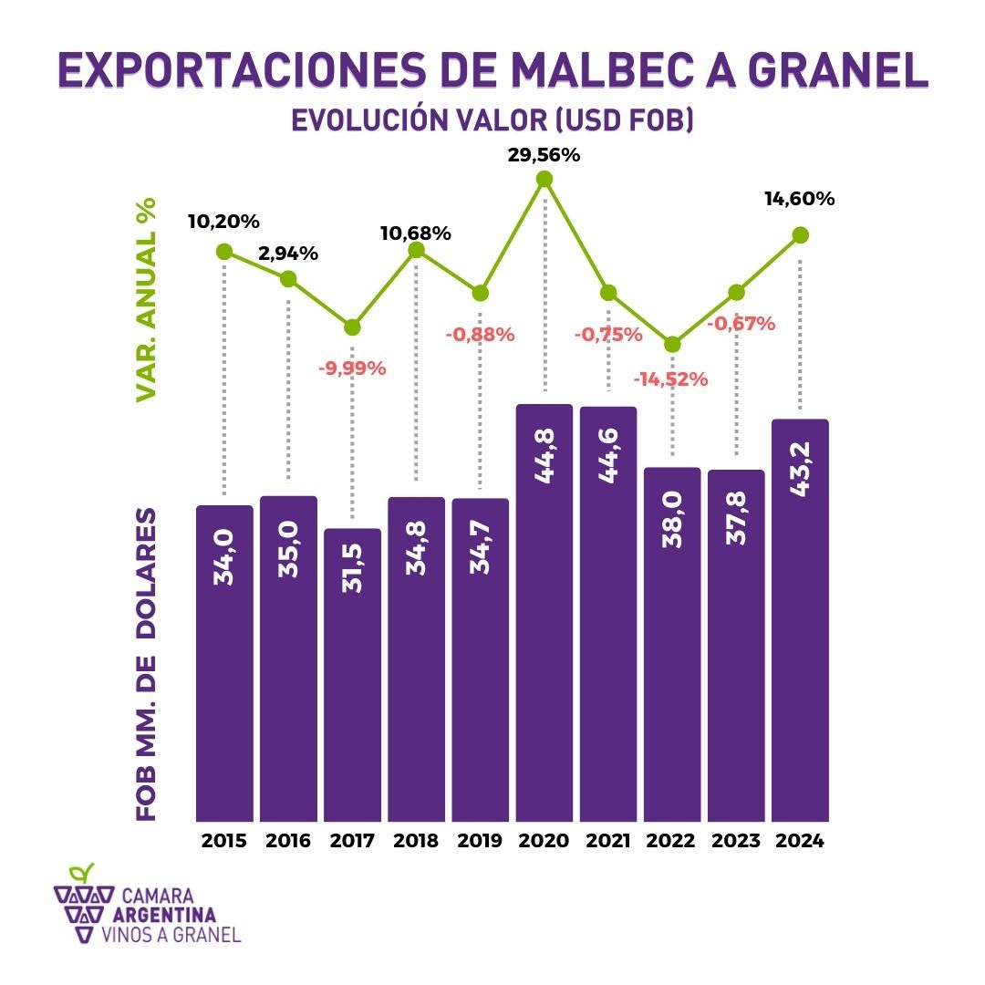 Aún así, las exportaciones de vino a granel en general y de Malbec en particular vienen transitando durante este periodo la misma suerte que las ventas al exterior de vinos fraccionados: sufrieron una caída. En el caso de las exportaciones de Malbec se ubican un 12% por debajo del promedio de los últimos 6 años.