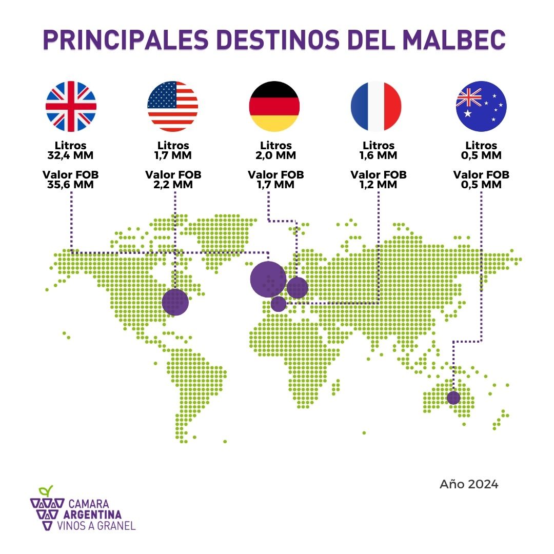 Llega a 13 países. Según datos del cierre de 2024, Reino Unido sigue liderando la lista con 32,4 millones de litros (por un valor FOB de 35,6 millones de U$D); el segundo es Estados Unidos que compra a un precio mayor, sumando 2,2 millones de dólares y 1,7 millones de litros. Le siguen Alemania, que compra a un precio menor, con 2 millones de litros y 1,7 millones de dólares el año pasado; Francia está en cuarto lugar con 1,6 millones de litros y 1,2 millones de U$D FOB y por último Australia con 0,5 millones de litros, y 0,5 millones de dólares.