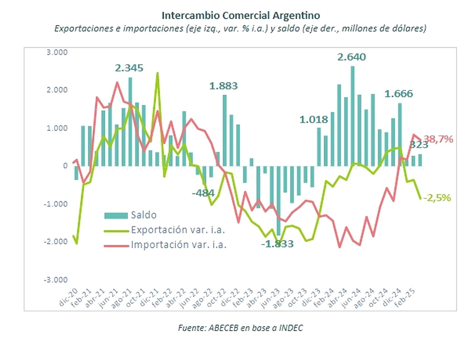 Desde la consultora Abeceb, plantean que el primer trimestre de 2025 cierra con un superávit en la balanza comercial acumulado de US$ 761 millones, marcando una sustancial reducción respecto del superávit de US$ 4.401 millones que se había acumulado en igual plazo de 2024.