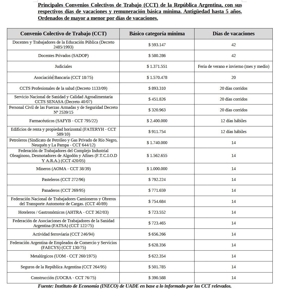 Un informe elaborado por el Instituto de Economía (INECO) de UADE sobre los Convenios Colectivos de Trabajo (CCT) y sindicatos, pone en evidencia que esas brechas se producen más que por la cantidad de trabajadores afiliados que agrupan, por su capacidad de negociación sobre días de vacaciones, remuneraciones básicas y beneficios.