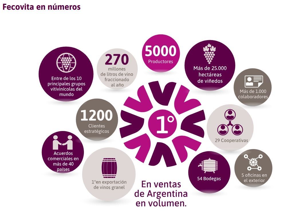 Se trata del grupo cooperativo vitivinícola más grande del mundo y cuenta con un modelo que es único en Argentina y con pocos casos similares que se podrían enumerar en el resto de las regiones productoras. Fecovita se encuentra entre los 10 principales grupos en el sector del mundo, con acuerdos comerciales en más de 40 países, con cinco oficinas en el exterior y 1.200 clientes estratégicos.