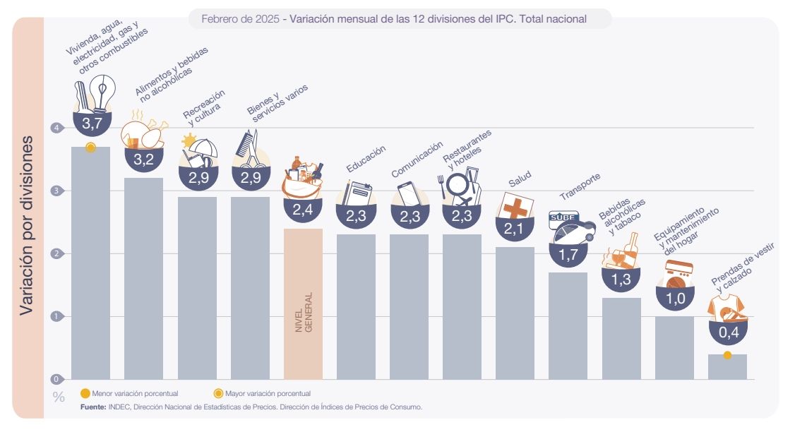 El impacto de la comida en la variación de la inflación de febrero -2,4%- no puede ser dejado de lado, debido a que fue el segundo rubro que más incidió sobre el número final, detrás del ítem vivienda, agua, electricidad, gas y Otros combustibles. “La división que registró la mayor incidencia en todas las regiones fue Alimentos y bebidas no alcohólicas (3,2%), por los aumentos en carnes y derivado” informó Indec.