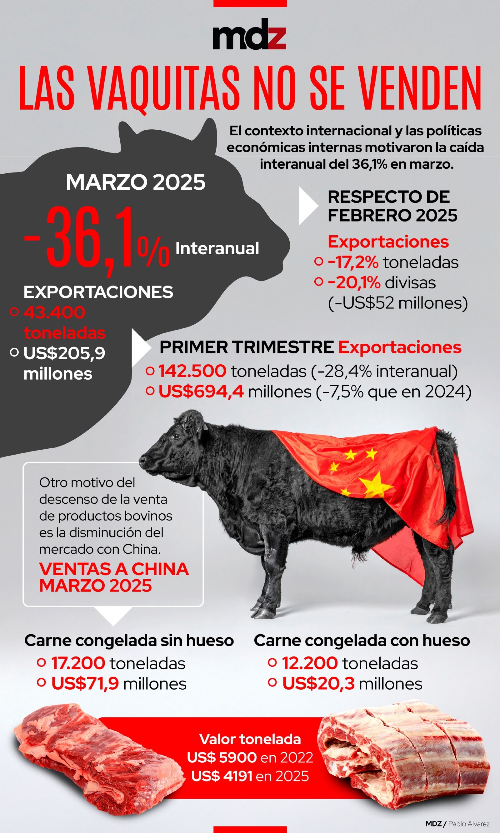 Otro motivo que se resalta entre los causantes de este descenso de la venta de productos bovinos es la disminución del mercado con China. El gigante asiático disminuyó el volumen de compra de carne congelada sin hueso en un 52%. Mientras que, entre agosto y noviembre del año pasado, adquirió 36.000 toneladas, y en marzo de 2025 demandó sólo 17.161.
