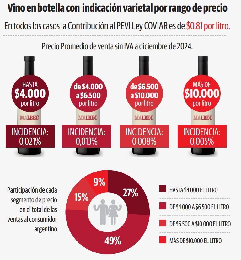 Estas cifras son fijas y su incidencia en el valor final del vino varía según el segmento al que se lo destine. Incluso, los vinos de más alto valor en el mercado son los que menos “afectados” se ven por el aporte a Coviar. Por ejemplo, un vino en caja de cartón sin mención varietal con un precio promedio de $2.585 por litro tuvo una incidencia de 0,019% en su precio. En tanto, un Malbec de más $10.000 por litro tuvo una incidencia de 0,005% en su valor sin IVA.