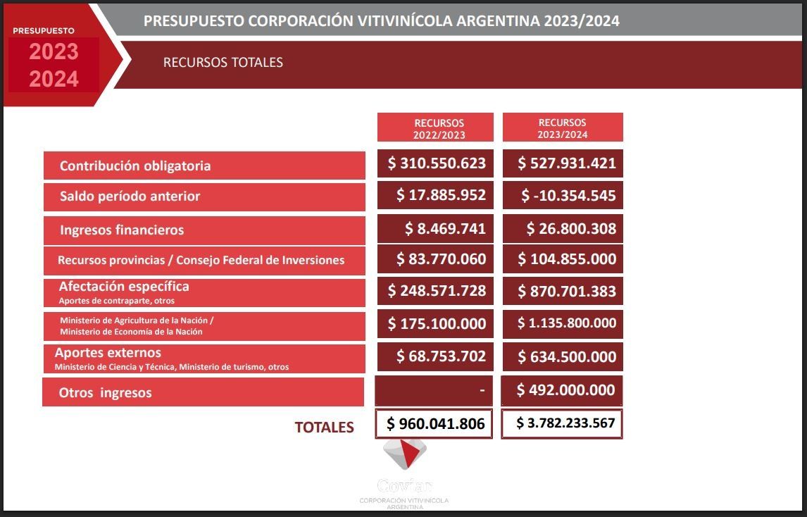 Conforme al informe presentado por la propia Coviar, haciendo una comparativa con los ingresos que se habían dado en la temporada 2022/2023, los aportes de contribución obligatoria pasaron de $310.550.623 a los mencionados $527.931.421. Por ingresos financieros se recibieron $26.800.308 (antes $8.469.741) y las provincias o el CFI transfieren a la Corporación $104.855.000 (en el ejercicio anterior $83.770.060). Hasta ahí, todos los aumentos resultan moderados y hasta por debajo de la inflación anual que se registró en 2023 del 211,4% en promedio.