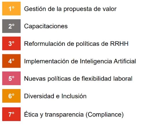 Las áreas de foco para Recursos Humanos en 2025 incluyen la gestión de la propuesta de valor, la implementación de políticas de flexibilidad laboral y el fortalecimiento de las estrategias de diversidad e inclusión. Además, se observa un creciente interés en la incorporación de inteligencia artificial para optimizar procesos internos y mejorar la experiencia del colaborador.