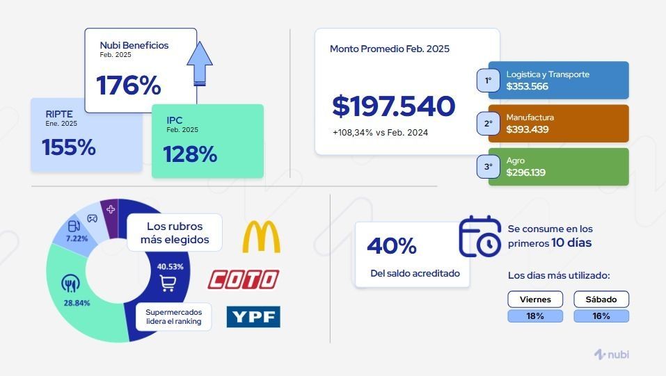 Un informe realizado por Nubi, la fintech de Grupo Comafi, revela que durante el 2024 se registró un aumento del 176% en materia de beneficios corporativos para empleados. Un número que refleja que este tipo de propuestas de valor no sólo superan los aumentos de salarios promedio, que fue del 155% en el mismo año, sino que también está por encima del IPC (128%).
