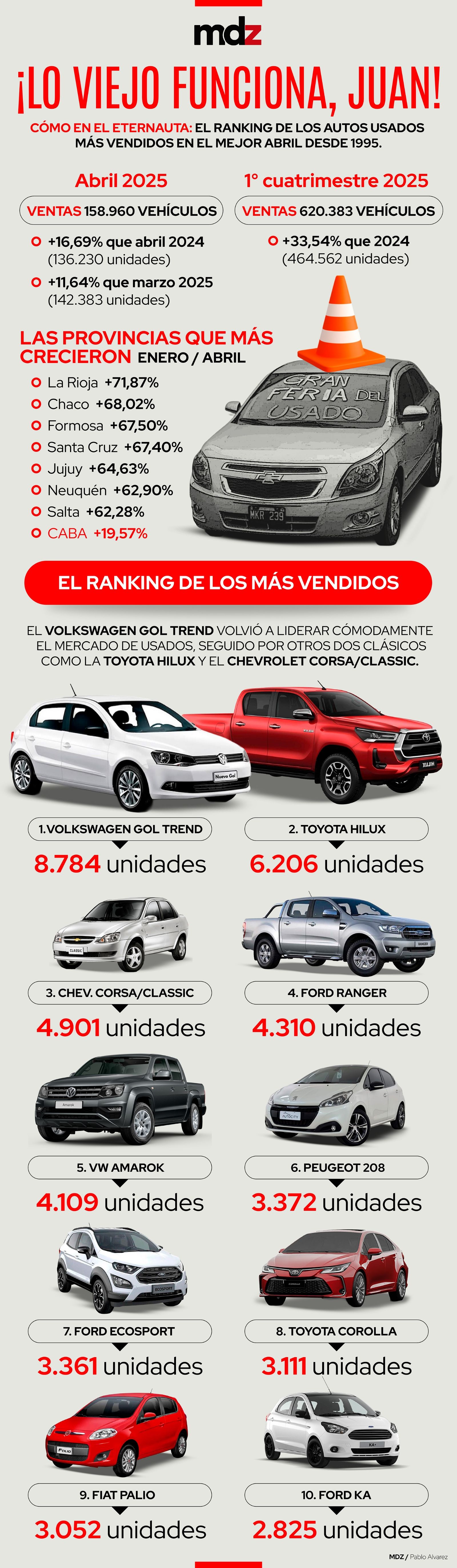 El Volkswagen Gol y Trend volvió a liderar cómodamente el mercado de usados, con 8.784 unidades vendidas en abril. Lo siguieron la Toyota Hilux (6.206), el Chevrolet Corsa/Classic (4.901) y las pickups Ford Ranger (4.310) y VW Amarok (4.109).