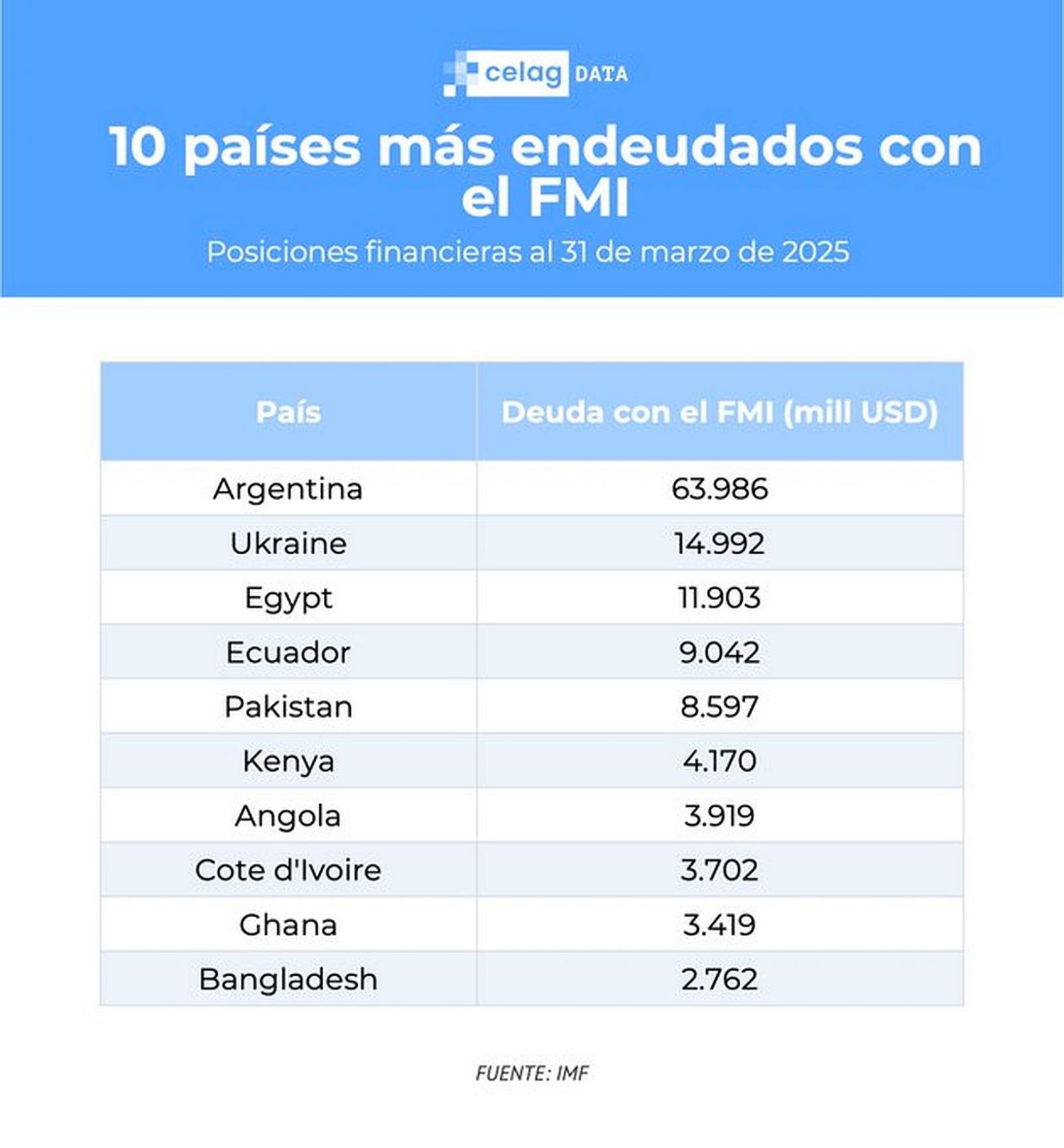 Según datos del propio FMI, relevados por la consultora Celag, la Argentina cuadruplica el monto de crédito del FMI respecto del segundo del ránking y supera la suma del total de deuda de los siguientes 9 en la lista de los más endeudados.
