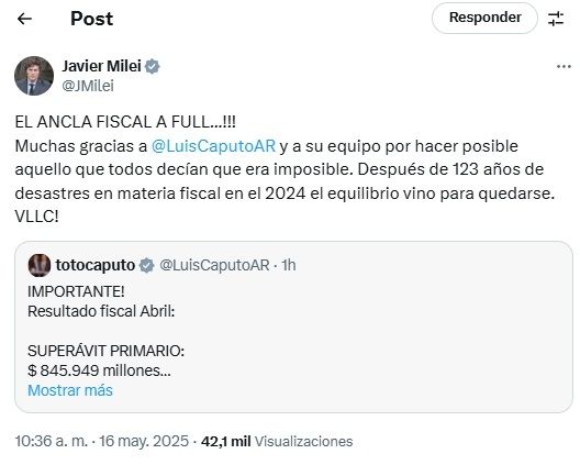 Acto seguido, el propio presidente Javier Milei reposteó el tuit, destacando que el ancla fiscal es una herramienta clave hoy para el manejo de la economía.
