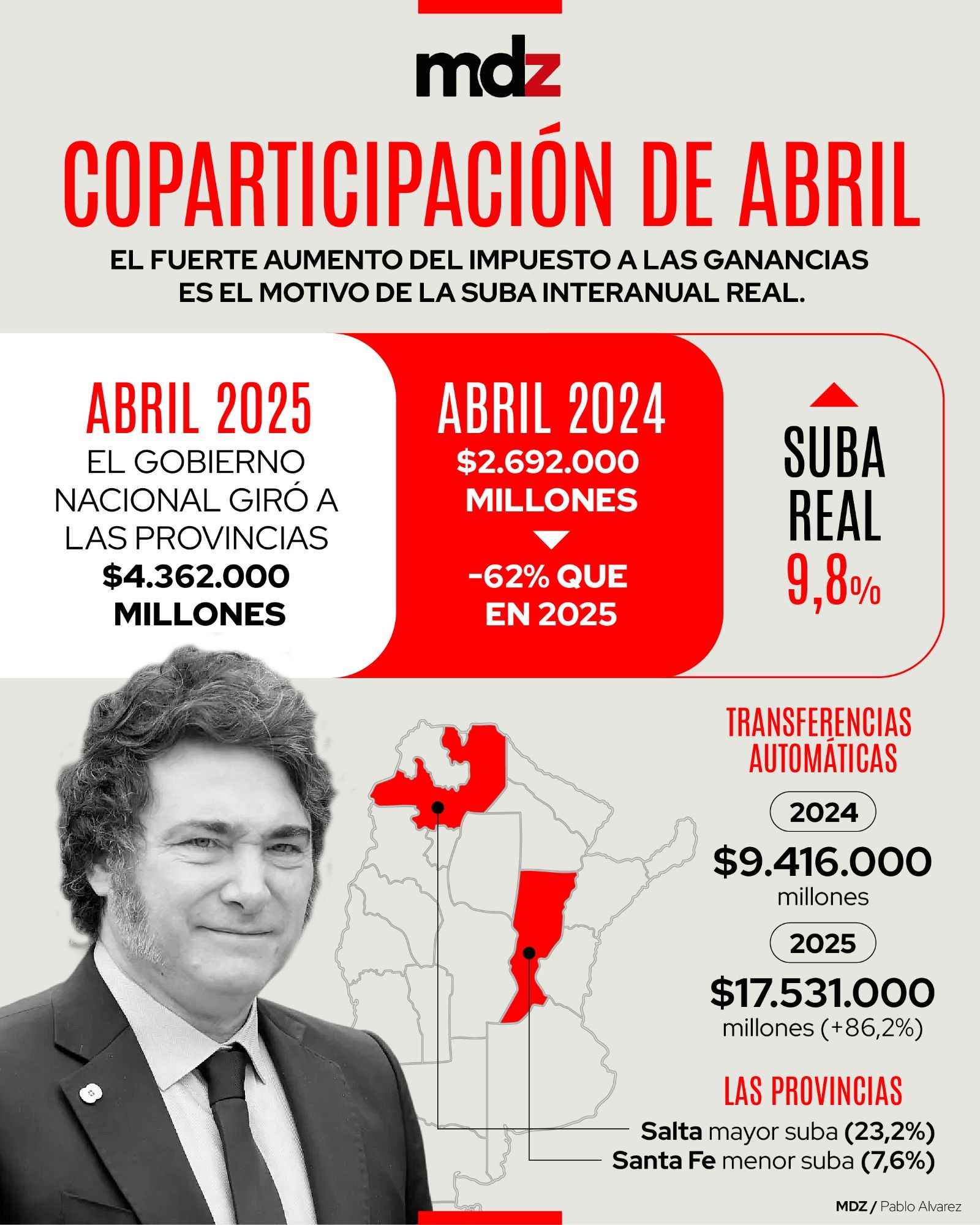 En el acumulado a abril de 2025, las transferencias automáticas totales alcanzaron los $17.531.000 millones. Frente a los $9.416.000 millones del mismo período del año anterior, exhibieron una "variación nominal del 86,2%. Descontando la inflación, la cifra se traduce en una suba real del 14,2% para el primer cuatrimestre del año.