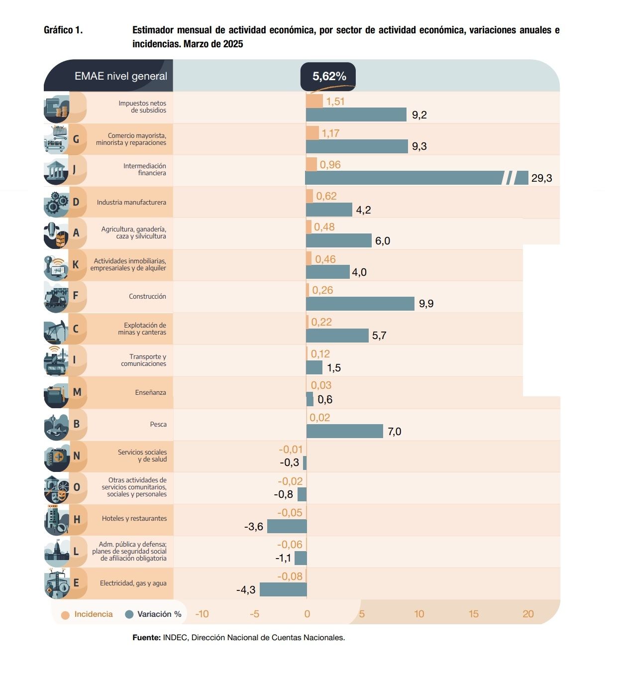 Por su parte, cinco sectores de actividad registraron caídas en la comparación interanual, entre los que se destacan Electricidad, gas y agua (-4,3%) y Hoteles y restaurantes (-3,6%).