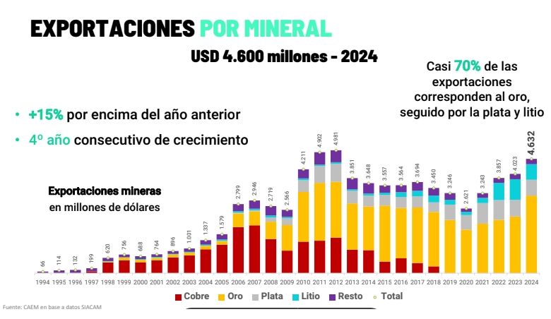 La Directora Ejecutiva de CAEM, Alejandra Cardona, indicó que en 2024 las exportaciones mineras alcanzaron los US$4.600 millones, lo cual representa un crecimiento del 15% respecto al año anterior y posiciona al sector como el sexto complejo exportador del país. Detalló que cerca del 70% de las exportaciones se concentraron en oro, seguidas por plata y litio.