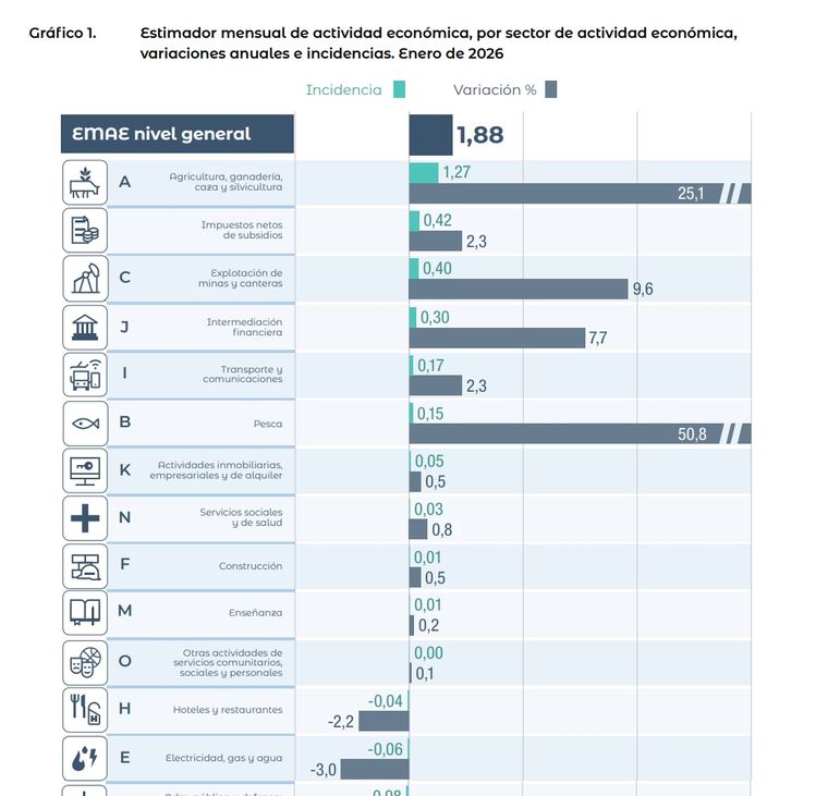 Diez de los sectores de actividad que conforman el EMAE registraron subas interanuales en enero, con fuerte incidencia de la Pesca(50,8%) y Agricultura, ganadería, caza y silvicultura (25,1%). Este último rubro fue el que mayor inidencia tuvo en el registro de la actividad con un 25,1%, sumando junto a la pesca un 1,7 puntos porcetuales del total de la mejora.