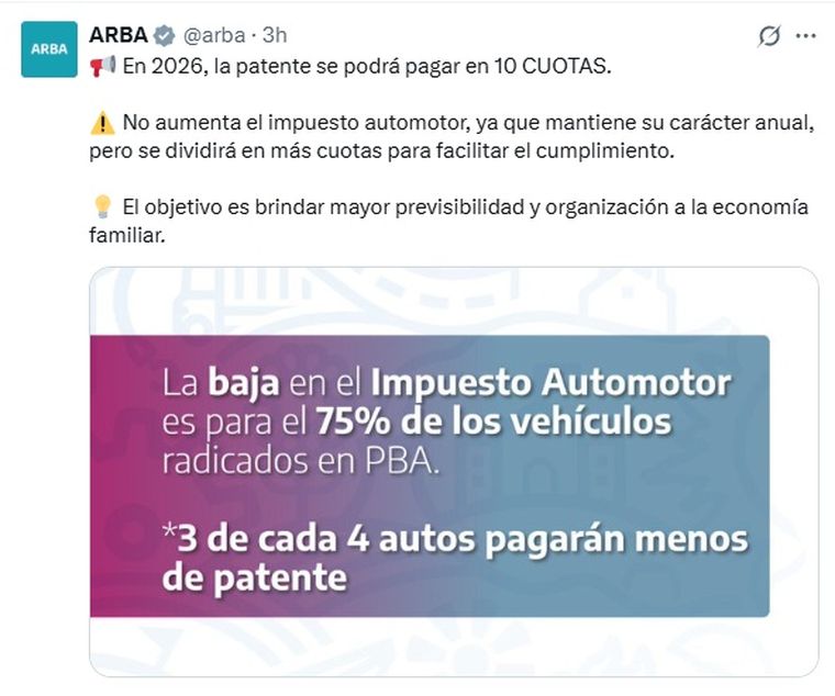 "En 2026, la patente se podrá pagar en 10 CUOTAS", publicó ARBA en su cuenta de X y aclaró que "no aumenta el impuesto automotor, ya que mantiene su carácter anual, pero se dividirá en más cuotas para facilitar el cumplimiento".