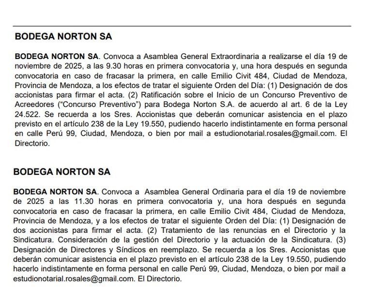 El Concurso aún no es abierto por la justicia, pero antes habrá una instancia clave: la Asamblea de Accionistas de Norton, donde se tratará ese pedido. La Asamblea fue convocada para el 19 de noviembre y no se hará en la sede de la bodega, en Luján, sino en un estudio de Ciudad. Allí se puso como primer orden del día la “ratificación del Inicio de un Concurso Preventivo de Acreedores”. Es decir, buscan el aval societario.