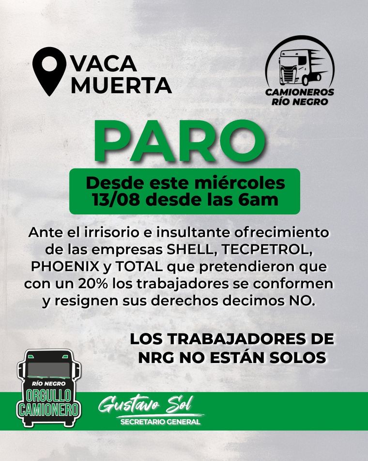 El Sindicato de Camioneros de la provincia de Río Negro realiza un paro total por tiempo indeterminado en la zona de Vaca Muerta a causa de los despidos en la empresa de transporte de arena NRG, tras el fracaso de las negociaciones.