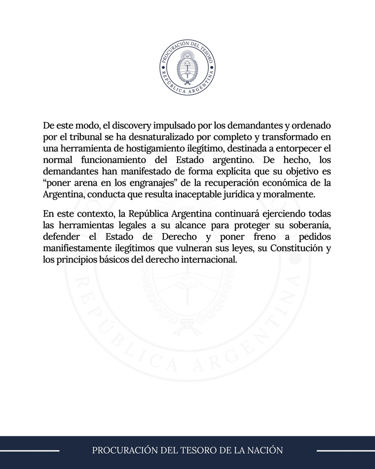 La defensa argentina marcó una diferencia tajante con gestiones anteriores. Según la PTN, mientras que en el pasado el país fue declarado en desacato en tres oportunidades, desde la asunción de la actual administración en diciembre de 2023 se ha cumplido estrictamente con el proceso de discovery (intercambio de pruebas).