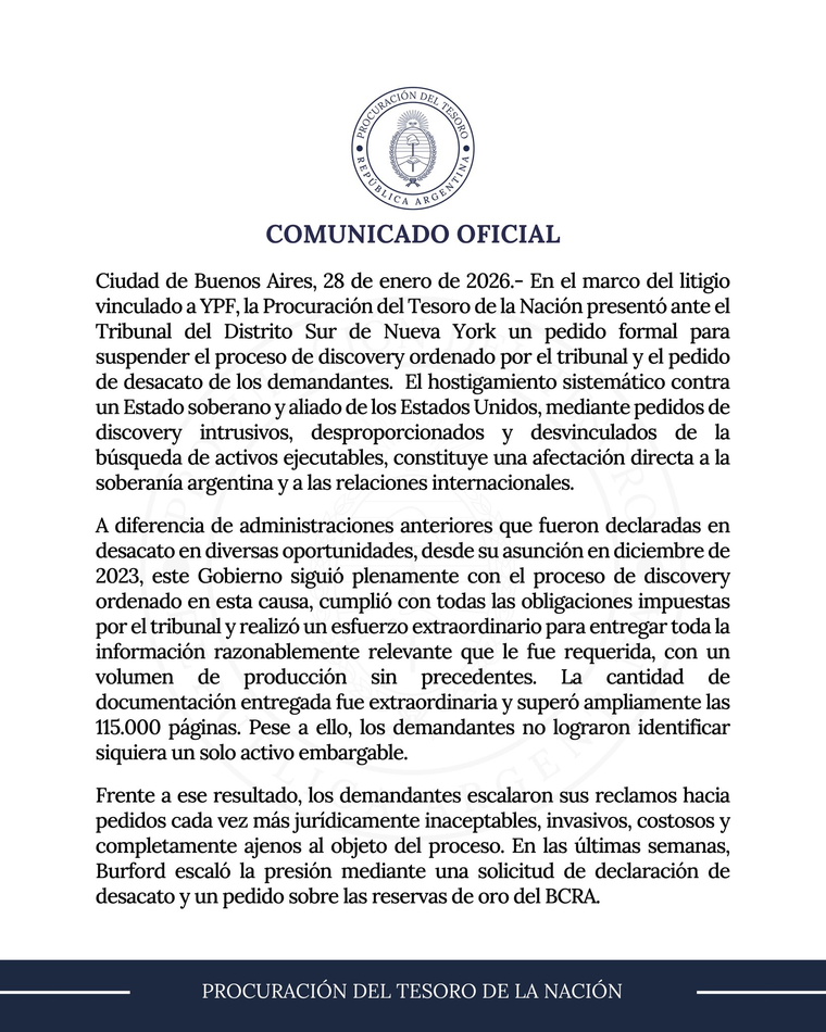 En un nuevo capítulo del litigio por la expropiación de YPF, la República Argentina pasó a la ofensiva legal en el Tribunal del Distrito Sur de Nueva York. A través de la Procuración del Tesoro (PTN), el Estado solicitó frenar las maniobras de los demandantes —liderados por el fondo Burford Capital—, denunciando un "hostigamiento sistemático" que vulnera la soberanía nacional y las relaciones internacionales.