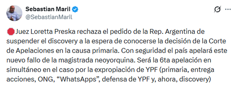 El analista Sebastián Maril, de Latam Advisors, anticipó en su cuenta de X lo que se viene: "Con seguridad el país apelará este nuevo fallo de la magistrada neoyorquina". Y puso en perspectiva la magnitud del frente judicial que enfrenta el Estado: "Será la sexta apelación en simultáneo en el caso por la expropiación de YPF (primaria, entrega acciones, ONG, 'WhatsApps', defensa de YPF y, ahora, discovery)".